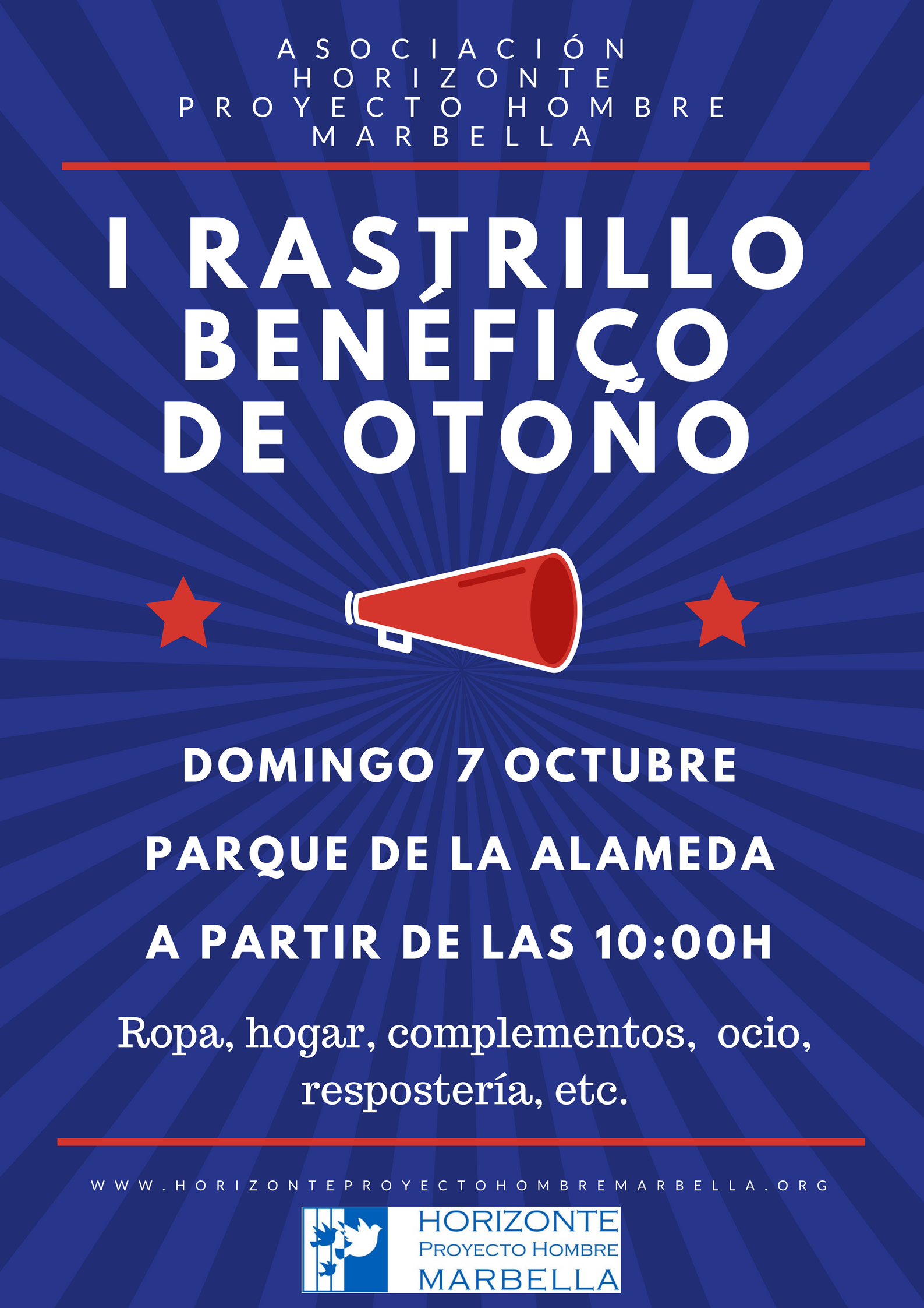 El próximo domingo 7 de octubre, a partir de las 10:00h, tendrá lugar la celebración del I Rastrillo Benéfico de Otoño de 2018 de la Asociación Horizonte en el Parque de la Alameda de Marbella.