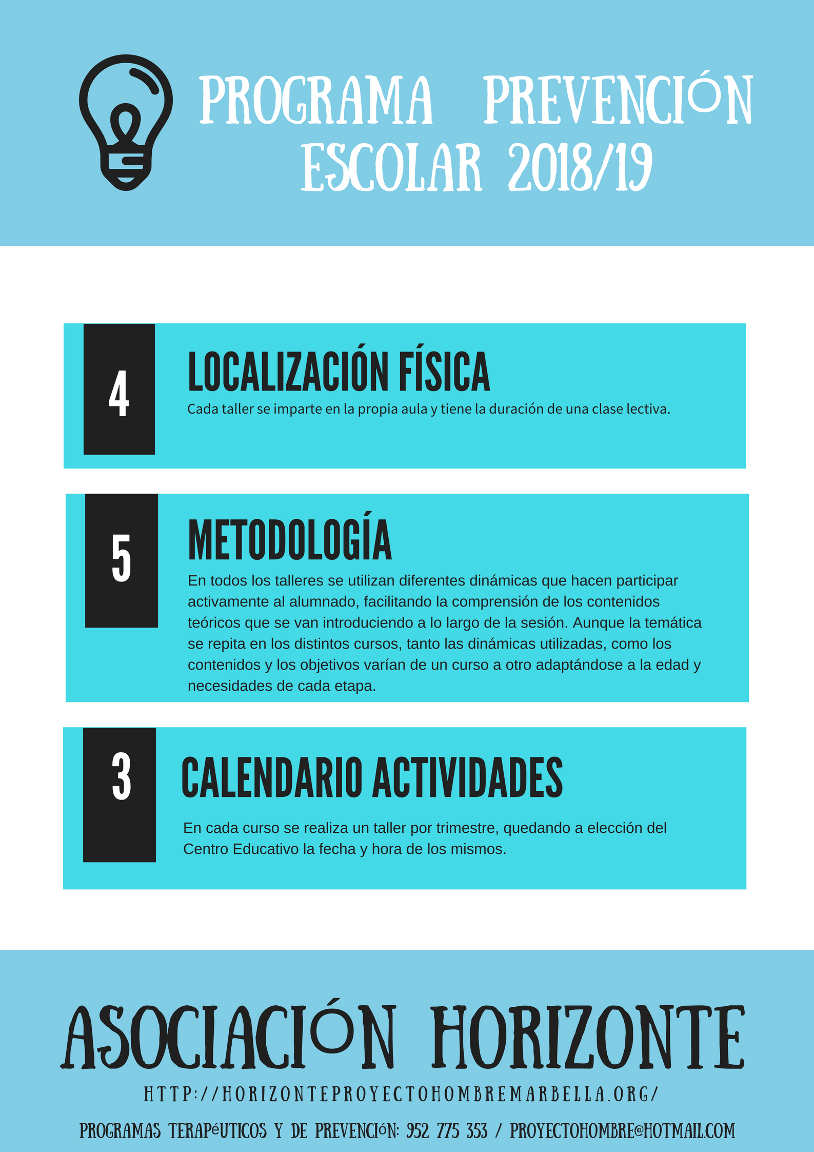 Consulte el listado de talleres de prevención escolar para el curso 2018/19: Dossier Prevención escolar curso 2018-19 y anexo de talleres